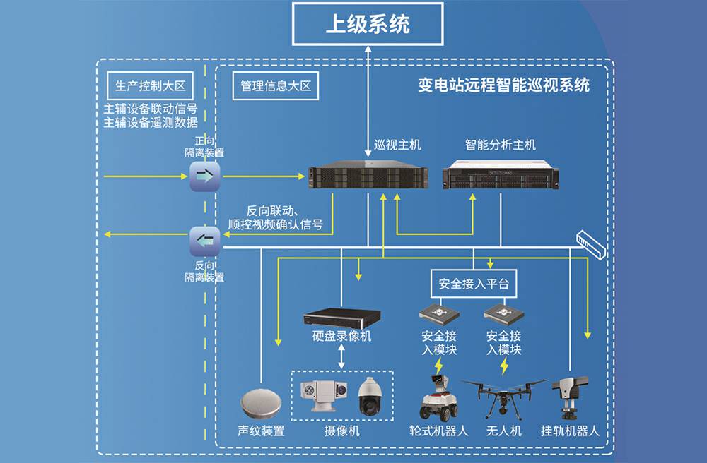 变电站远程智能巡视系统通过各类高清摄像机和室内外巡检机器人对现场巡视点位进行抓图和视频录制,利用人工智能图像识别技术,对设备、人员、环境、缺陷等进行智能化分析判断,从而实现变电站的智能化远程巡视。