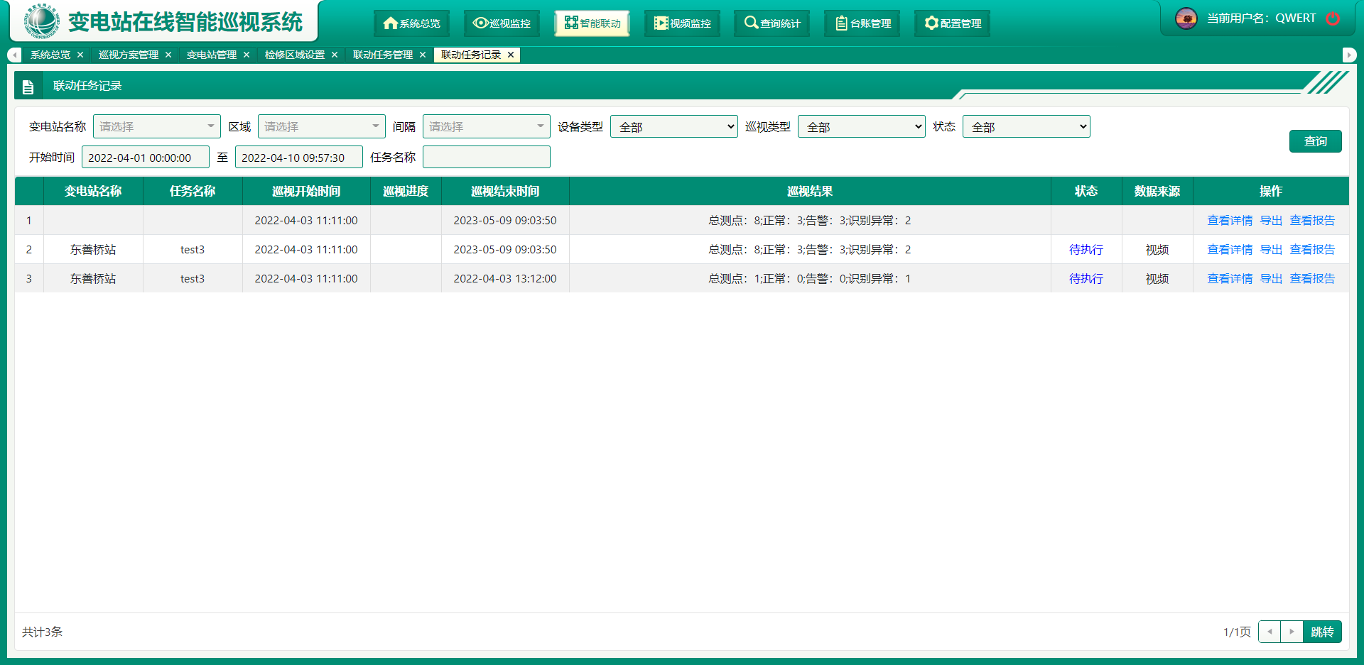 远程智能巡视系统获取主辅设备监控系统监测数据,整合主辅设备监控信息,从而实现主辅设备与巡视系统联动功能: (1)实现主设备SCADA监控系统变位信号和保护告警信号联动; (2)实现与辅控系统天气、消防、安防、门禁等状态联动功能; (3)实现与一键顺控系统联动功能。